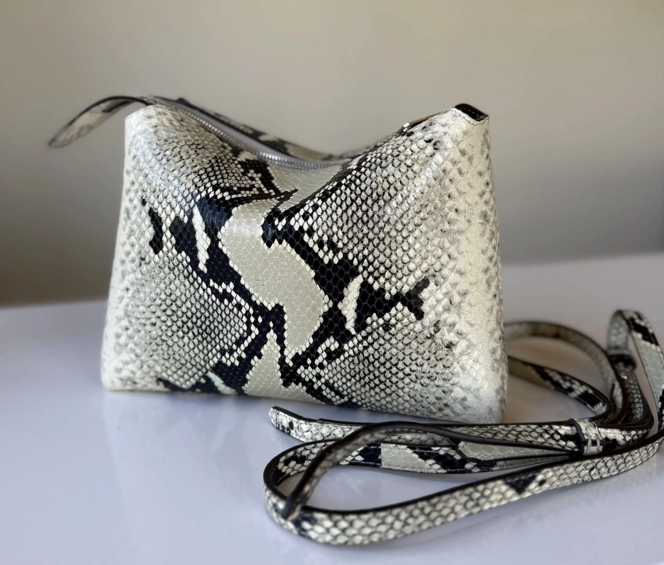 A clean top-zip closure keeps essentials secure, adding confidence for travel, crowded settings, or longer days out. The python-embossed surface is durable and well-suited to regular use, resisting visible wear more easily than smooth calfskin — a practical advantage for a textured finish.