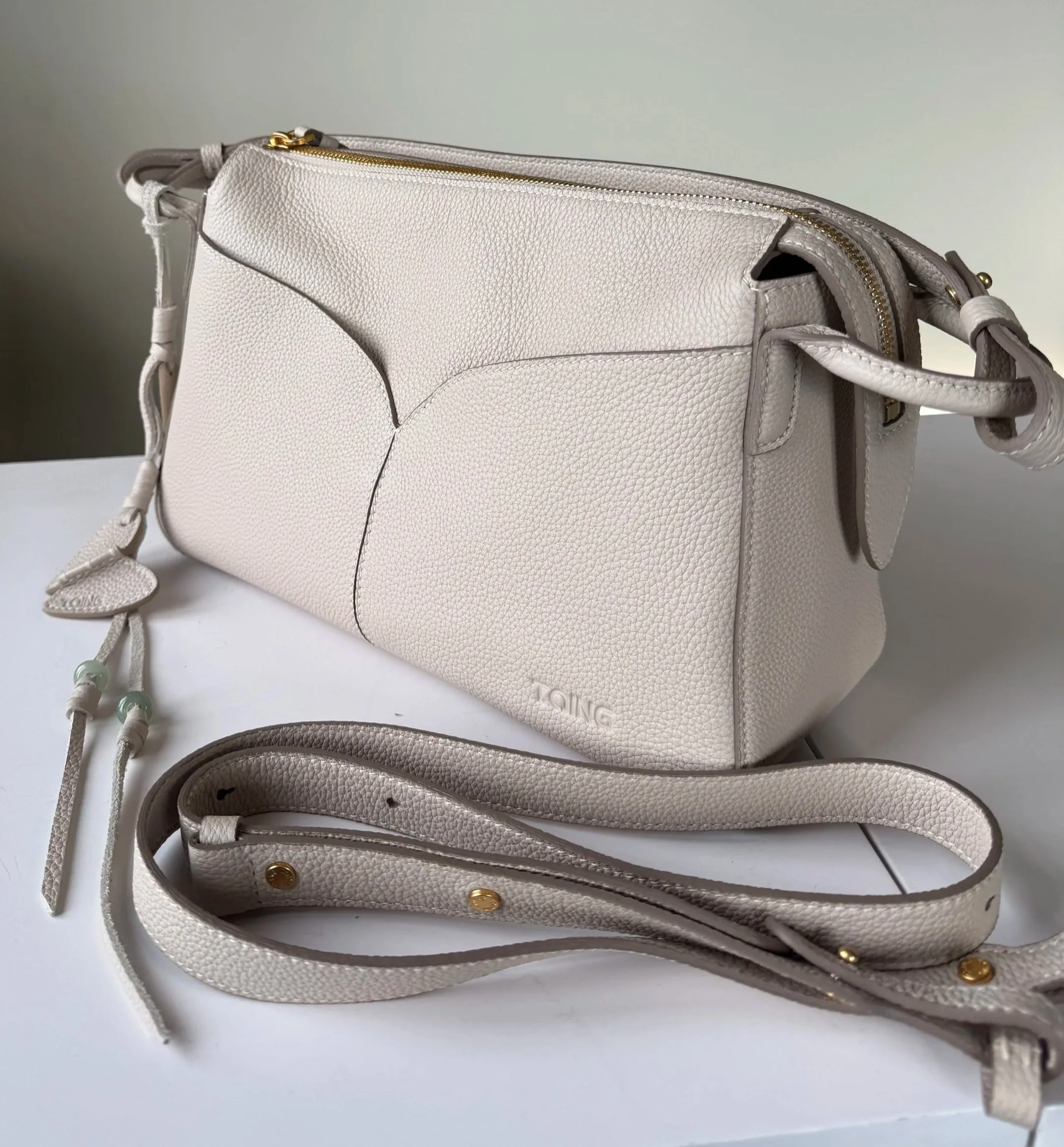 T.Qing Freeform Casual Boston Bag in Togo leather, shown in Bright Moon White with gold hardware.